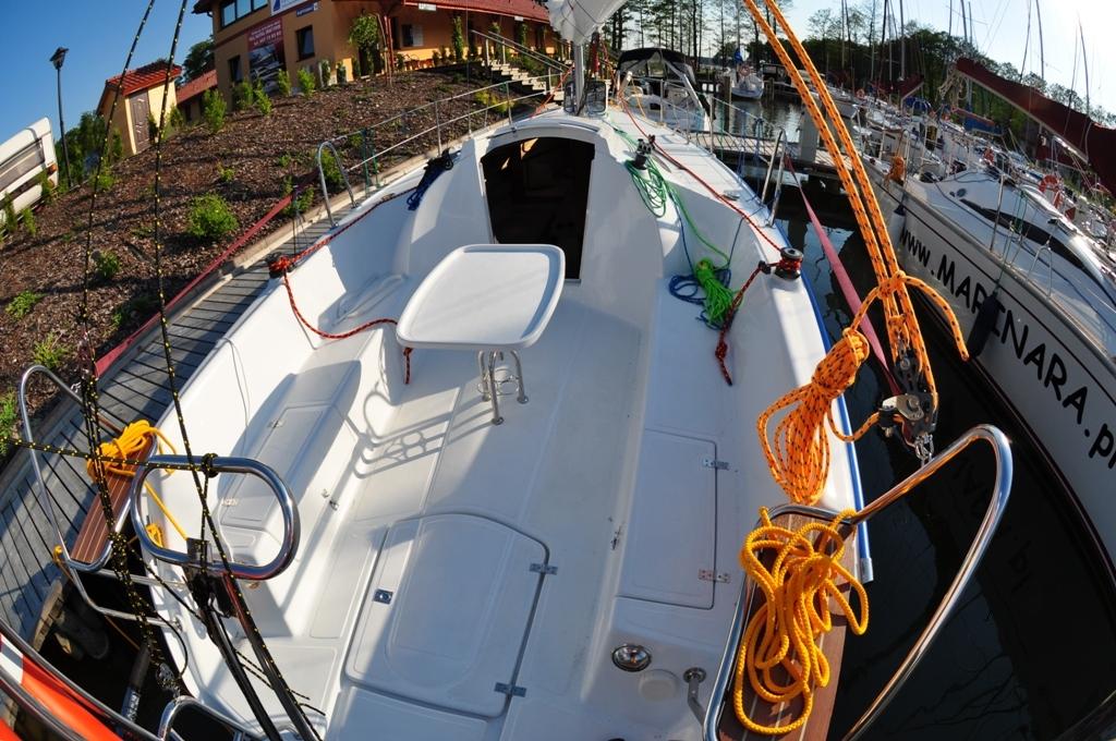 Wyposażenie dodatkowe: bramka do kladzenia masztu, sztywny sztag, roll fok, lazzy jack, instalacja wody - zbiornik, radio, mp3, TV, DVD, lodówka, ogrzewanie, instalacja 230 V